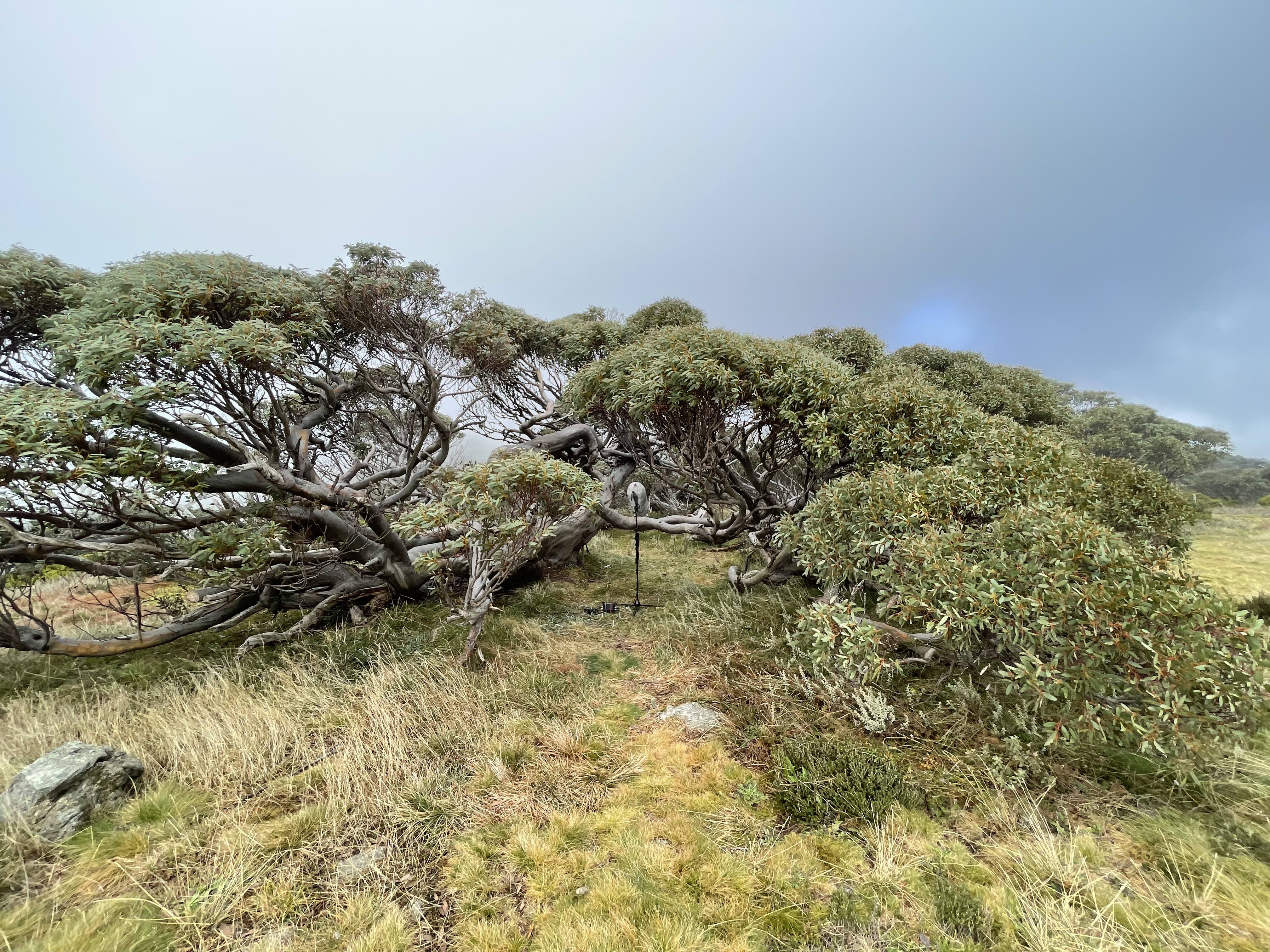 Wind gusting in snow gums, background voices in the distance. Recording made on Fryingpan Raceline near Windy Corner.